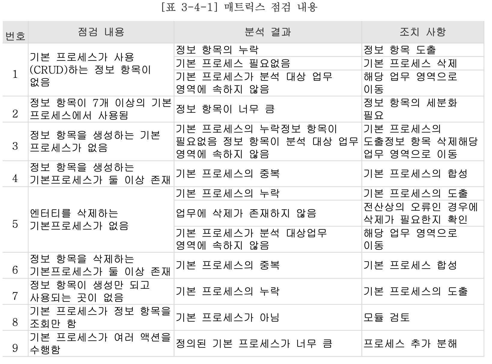 - 하나의 정보 항목을 생성, 수정, 삭제하는 프로세스의 합은 7개를 초과하지 않는 것이 보통이다. 이를 초과하는 경우에는 올바르게 정의되었는지를 확인한다.