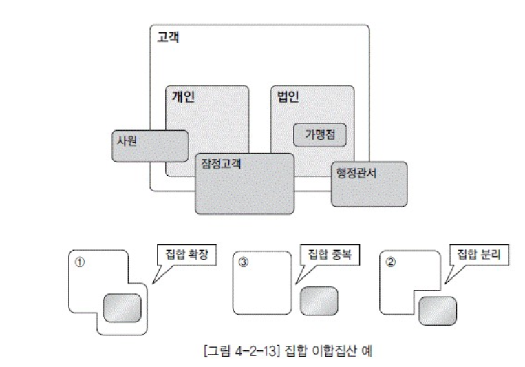 - 집합 간에는 상품과 고객처럼 전혀 포함 관계를 가지지 않거나, 고객과 사원처럼 일부가 포함되거나, 아니면 사원과 임원처럼 전체가 포함되는 세 가지 경우가 존재한다.
