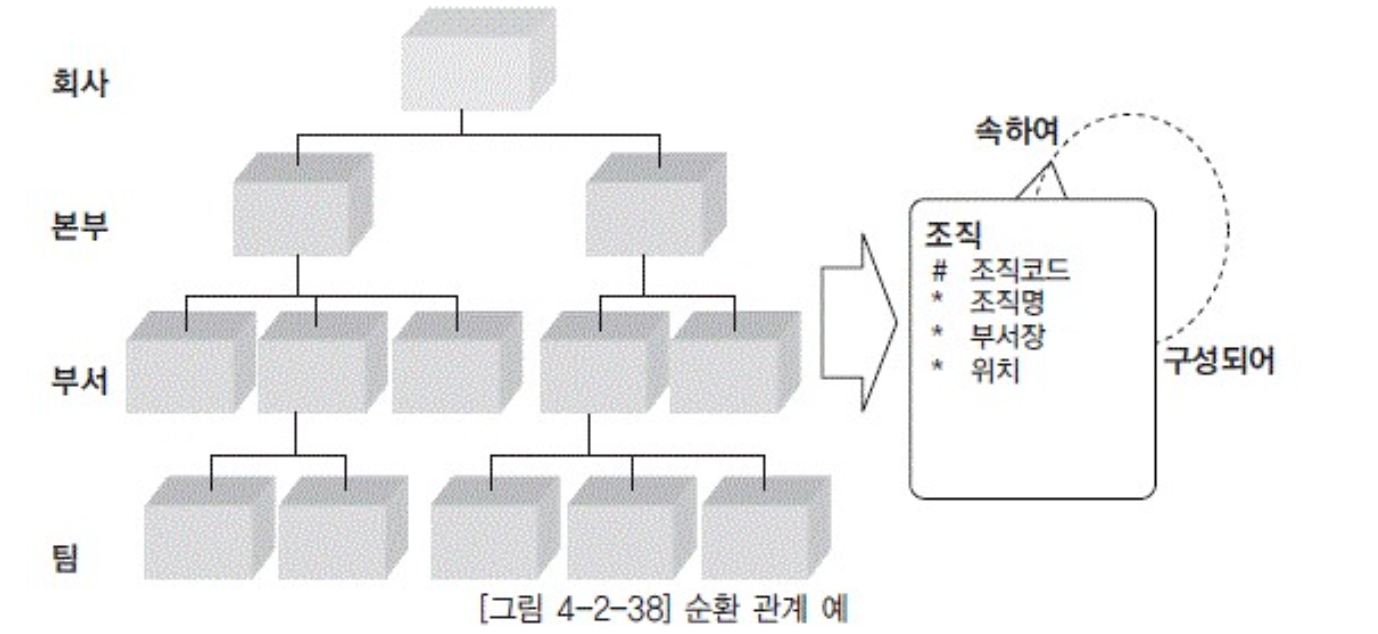 - 순환 모델은 필수(직선) 관계로 취급될 수 없고(무한 LOOP 발생), 반드시 선택사양 관계이다.