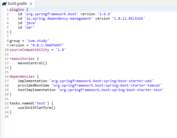 - build.gradle 파일에는 라이브러리 의존성 설정등 프로젝트 전반의 환경을 설정하는 내용이 있다.