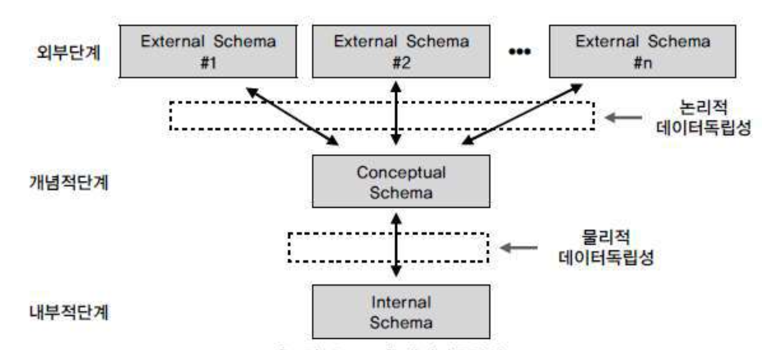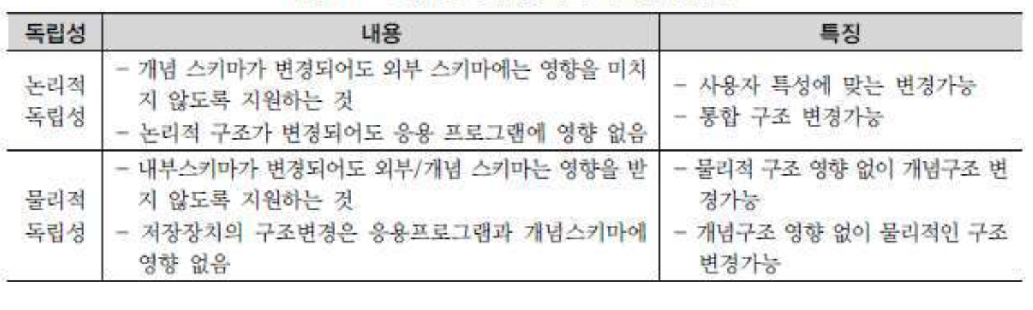 - 3단계로 개념이 분리되면서 각각의 영역에 대한 독립성을 지정하는 용어가 바로 논리적인 독립성과 물리적인 독립성이다.
