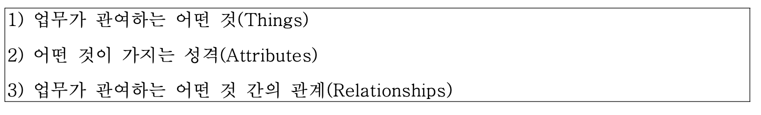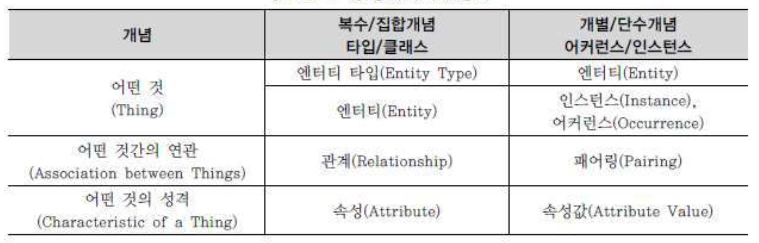 ※ 이 세 가지는 데이터 모델링을 완성해 가는 핵심 개념으로서 결국 엔터티, 속성, 관계로 인식되는 것이다. 사물이나 사건 등을 바라볼 때 전체를 지칭하는 용어를 어떤 것(Things)이라 하고, 그 어떤 것이 가지는 세부적인 사항을 성격(Attributes)이라고 할 수 있다.