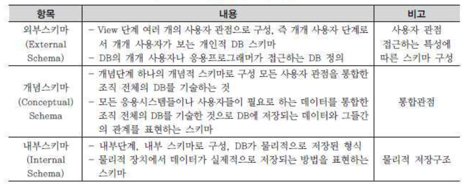 - 데이터베이스 스키마 구조는 3단계로 구분되고 각각은 상호 독립적인 의미를 가지고 고유한 기능을 가진다.