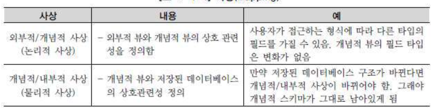 ※ 외부 화면이나 사용자에게 인터페이스하기 위한 스키마 구조는 전체가 통합된 개념 적 스키마와 연결된다는 것이 논리적 사상이다.