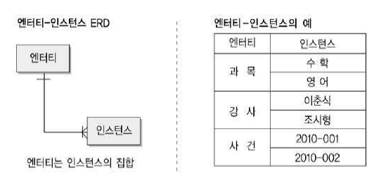 - 엔터티의 특징 중 '한 개'가 아니라 '두 개' 이상이라는 집합개념은 매우 중요한 개념이다.