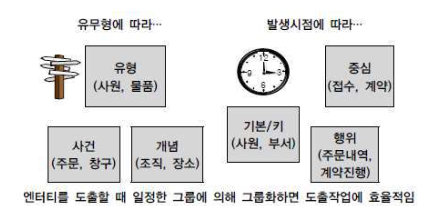 - 자신의 성격에 의해 실체 유형에 따라 구분하거나 업무를 구성하는 모습에 따라 구분이 되는 발생시점에 의해 분류될 수 있다.