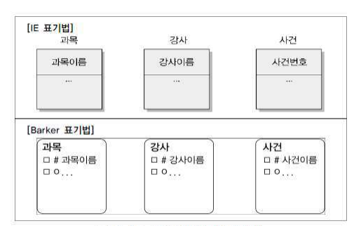 - 엔터티를 표현하는 방법은 각각의 표기법에 따라 조금씩 차이는 있지만 대부분 사각형으 로 표현된다. 다만 이 안에 표현되는 속성의