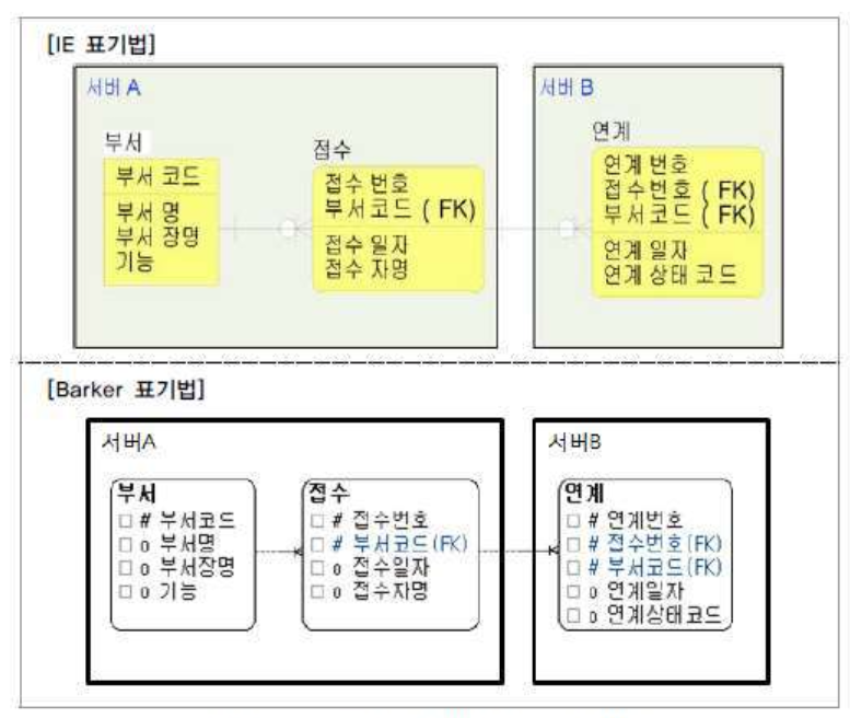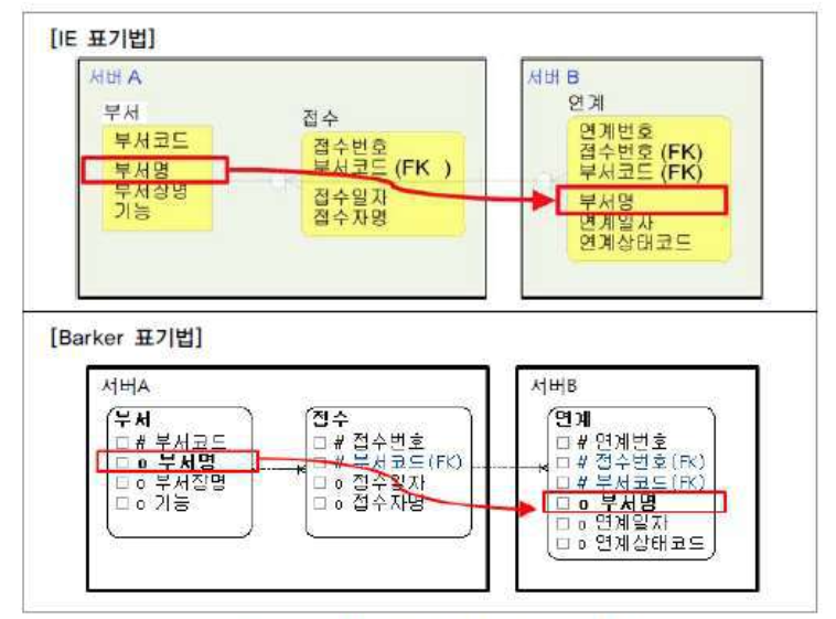 - 위의 분산 환경에 따른 데이터 모델을 다음과 같이 서버A에 있는 부서테이블의 부서명을 서버 B의 연계테이블에 부서명으로 속성