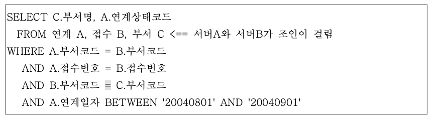 - 서버 A에 부서와 접수 테이블이 있고 서버 B에 연계라는 테이블이 있는데 서버 B에서 데이터를 조회할 때 빈번하게 조회되는 부서번호가 서버 A에 존재하기 때문에 연계, 접수, 부서 테이블이 모두 조인이 걸리게 된다. 게다가 분산데이터베이스 환경이기 때문에 다른 서버