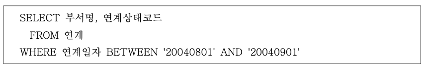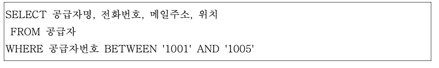 WHERE 공급자번호 BETWEEN '1001' AND '1005'