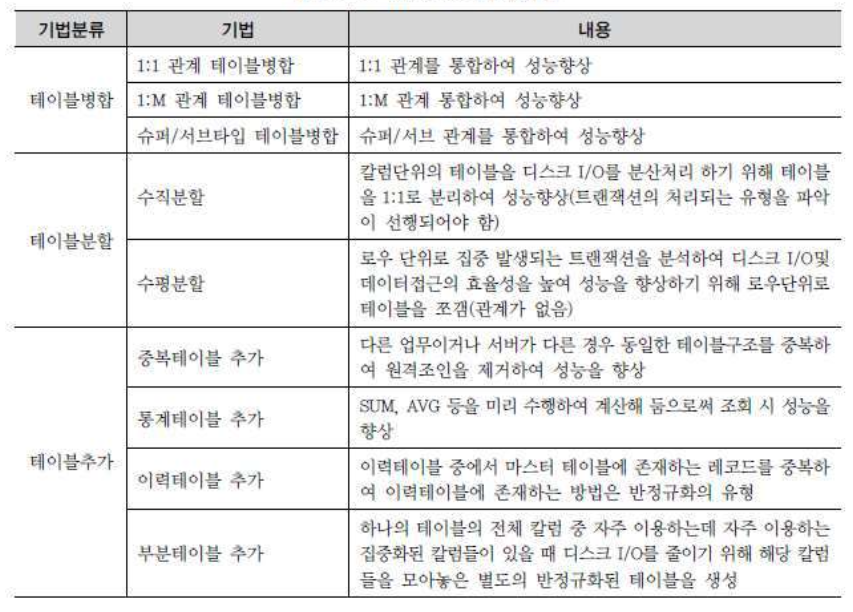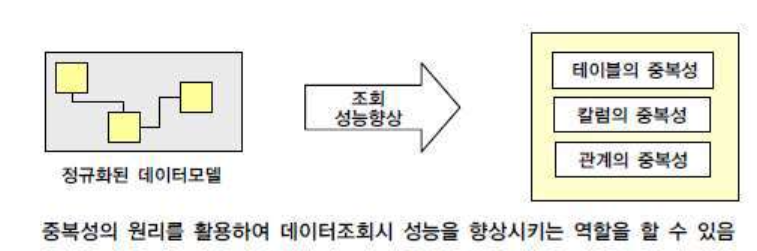 - 데이터 무결성이 깨질 수 있는 위험을 무릅쓰고 데이터를 중복하여 반정규화를 적용하는 이유는 데이터를 조회할 때 디스크 I/O량이 많아 성능이 저하되거나 경로가 너무 멀어 조 인으로 인한 성능저하가 예상되거나 칼럼을 계산하여 읽을 때 성능이 저하될 것이 예상되는