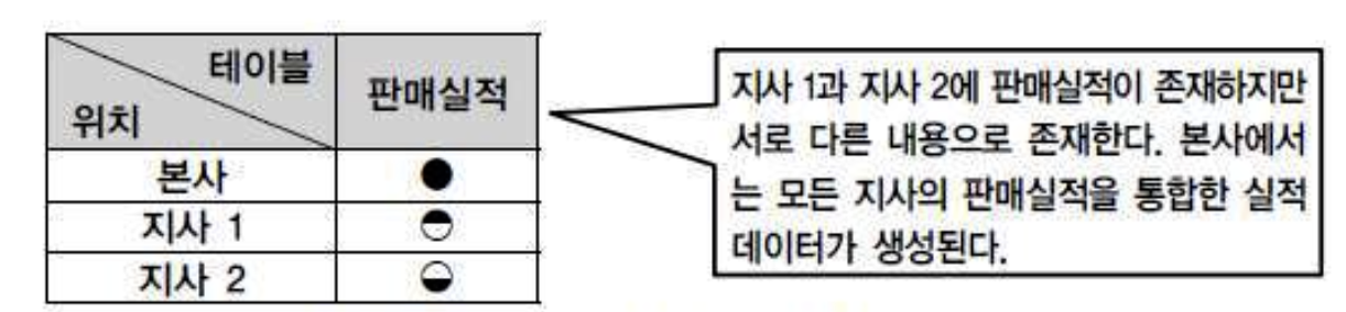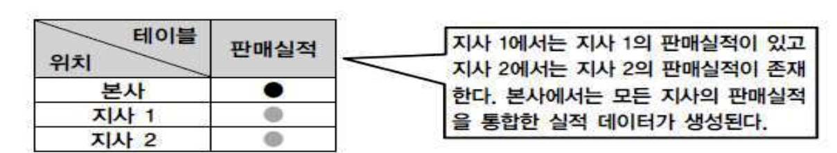 - 각 지사에서 데이터 처리가 용이할 뿐 만 아니라 전체 데이터에 대한 통합처리도 본사에 있는 통합 테이블을 이용하게 되므로 여러
