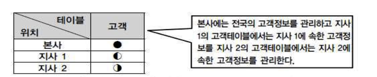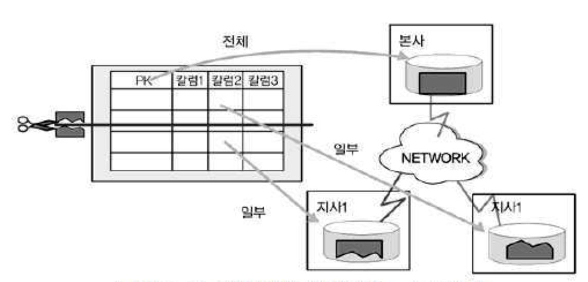 - 통합된 테이블을 한 군데(본사)에 가지고 있으면서 각 지사별로는 지사에 해당된 로우 (Row)를 가지고 있는 형태이다.