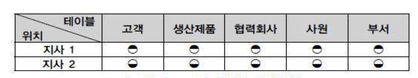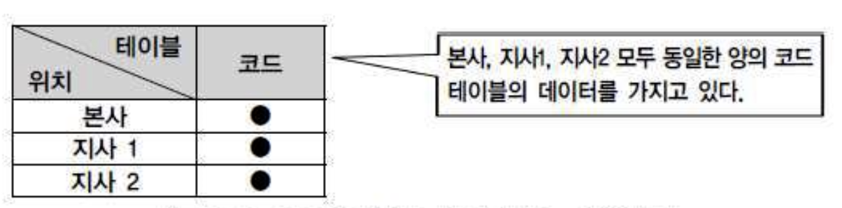 - 모든 지사에 있는 데이터량과 본사에 있는 데이터량이 다 동일하다. 본사와 지사모두 동일한 정 보를 가지고 있으므로 본사나 지사나