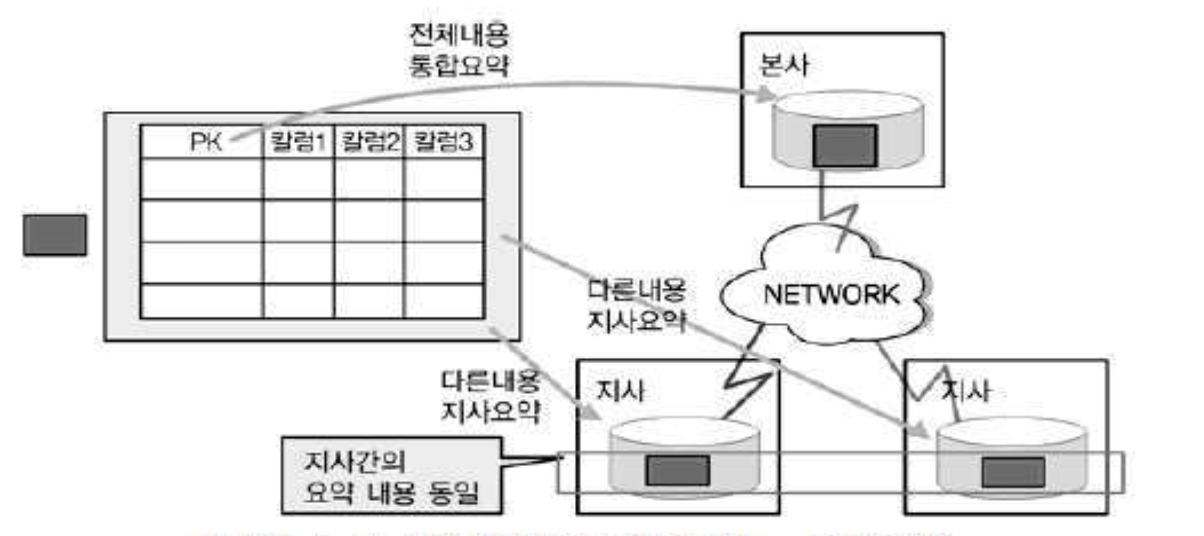 - 테이블 요약(Summarization) 분산은 지역 간에 또는 서버 간에 데이터가 비슷하지만 서로 다른 유형으로 존재하는 경우 있다.