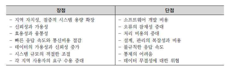 - 거리 또는 다른 서버에 접속하여 처리하므로 인해 발생되는 네트워크 부하 및 트랜잭션 집중에 따른 성능 저하의 원인을 분산된