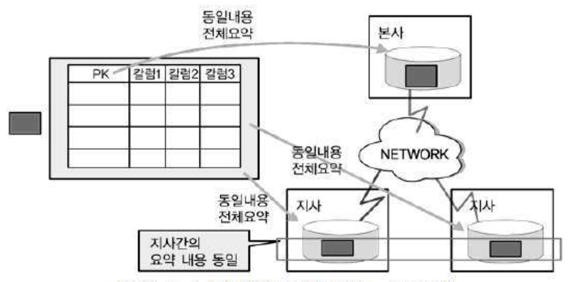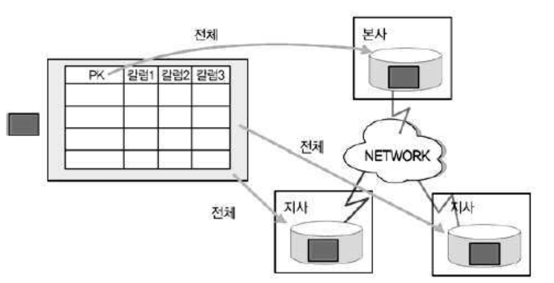 - 통합된 테이블을 한 군데(본사)에 가지고 있으면서 각 지사에도 본사와 동일한 데이터를 모두 가지고 있는 형태이다.