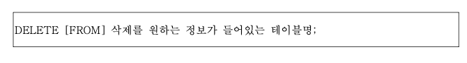 - DELETE FROM 다음에 삭제를 원하는 자료가 저장되어 있는 테이 블명을 입력하고 실행한다. 이때 FROM 문구는 생략이 가능한