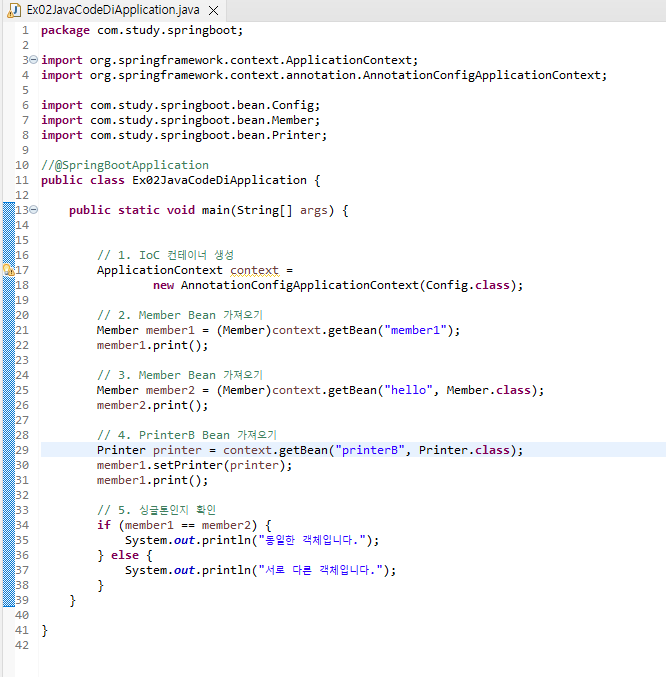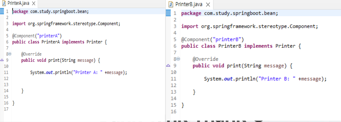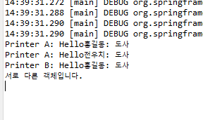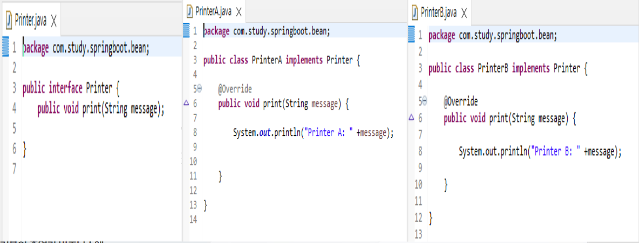 - 14라인: 유사한 객체가 printerA, printerB 등 여러 개일 때 빈의 이름으로 정확하게 지정