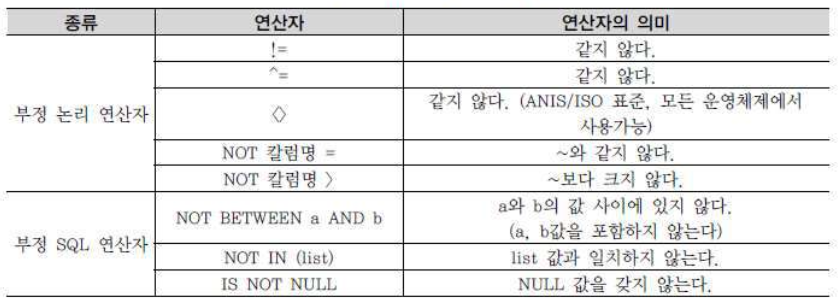 - 비교 연산자, SQL 비교 연산자에 대한 부정 표현을 부정 논리 연산자, 부정 SQL 연산 자로 구분할 수 있다.