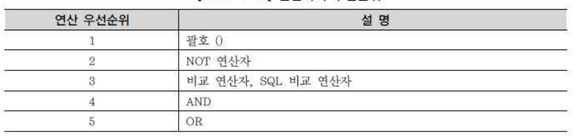 - 논리 연산자 중에서는 AND, OR의 순으로 처리된다.