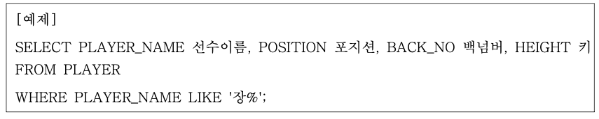 ex) “장”씨 성을 가진 선수들의 정보를 조회하는 WHERE 절을 작성한다.
