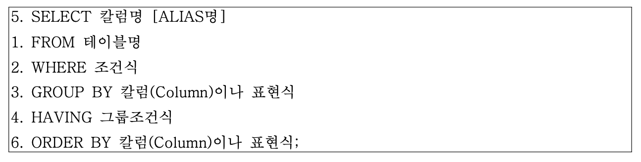 - GROUP BY 절과 ORDER BY가 같이 사용될 때 SELECT 문장은 6개의 절로 구성이 되 고, SELECT 문장의 수행 단계는 아래와 같다.