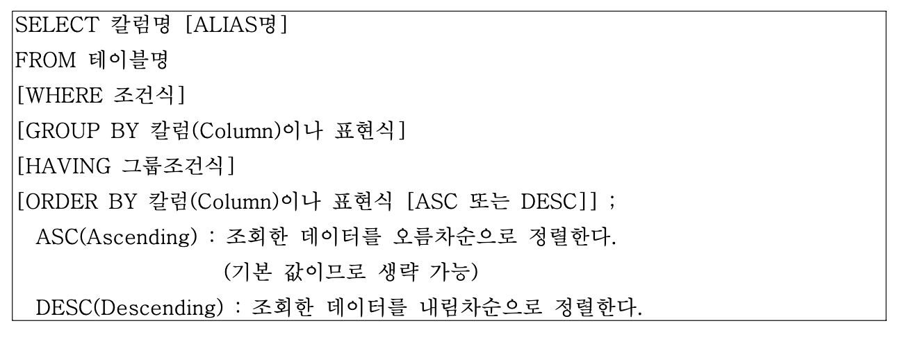 - 칼럼(Column)명 대신에 SELECT 절에서 사용한 ALIAS 명이나 칼럼 순서를 나타내는 정수도 사용 가능하다. 그리고 별도로 정렬
