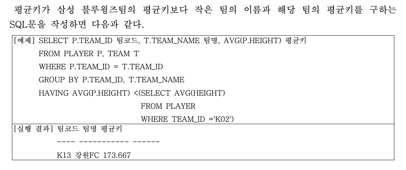 - HAVING 절은 그룹함수와 함께 사용될 때 그룹핑된 결과에 대해 부가적인 조건을 주기 위해서 사용한다.