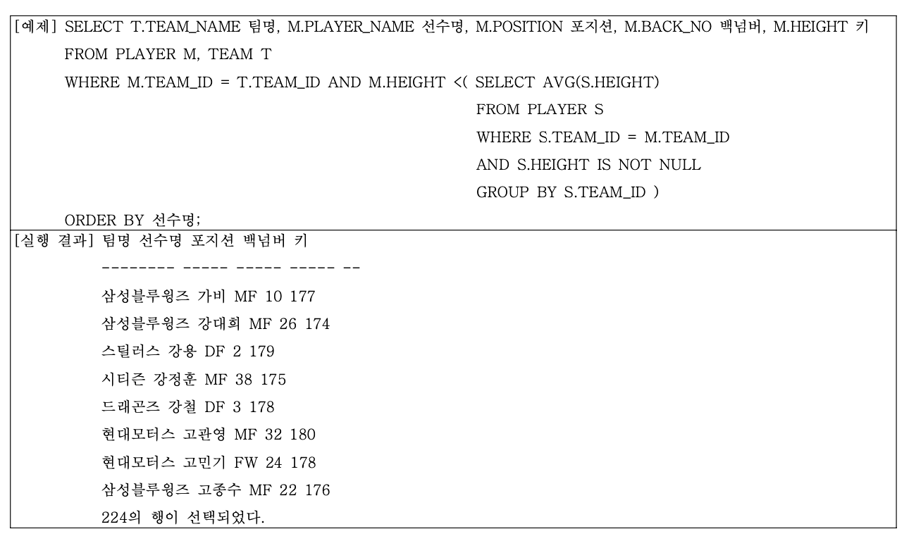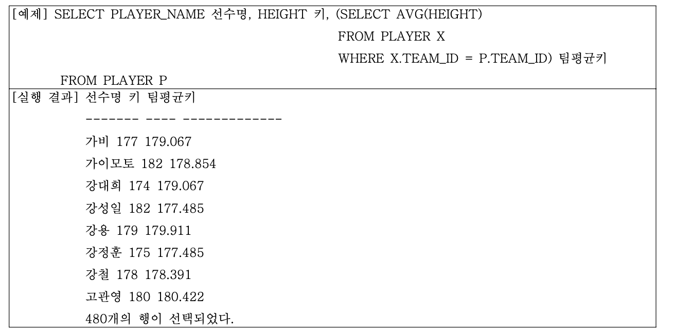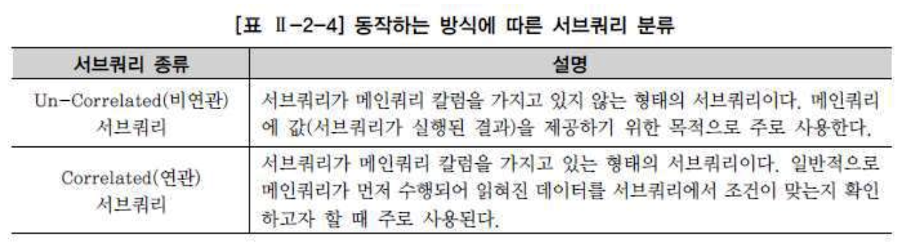 - 서브쿼리는 메인쿼리 의 칼럼을 모두 사용할 수 있지만 메인쿼리는 서브쿼리의 칼럼을 사용할 수 없다.