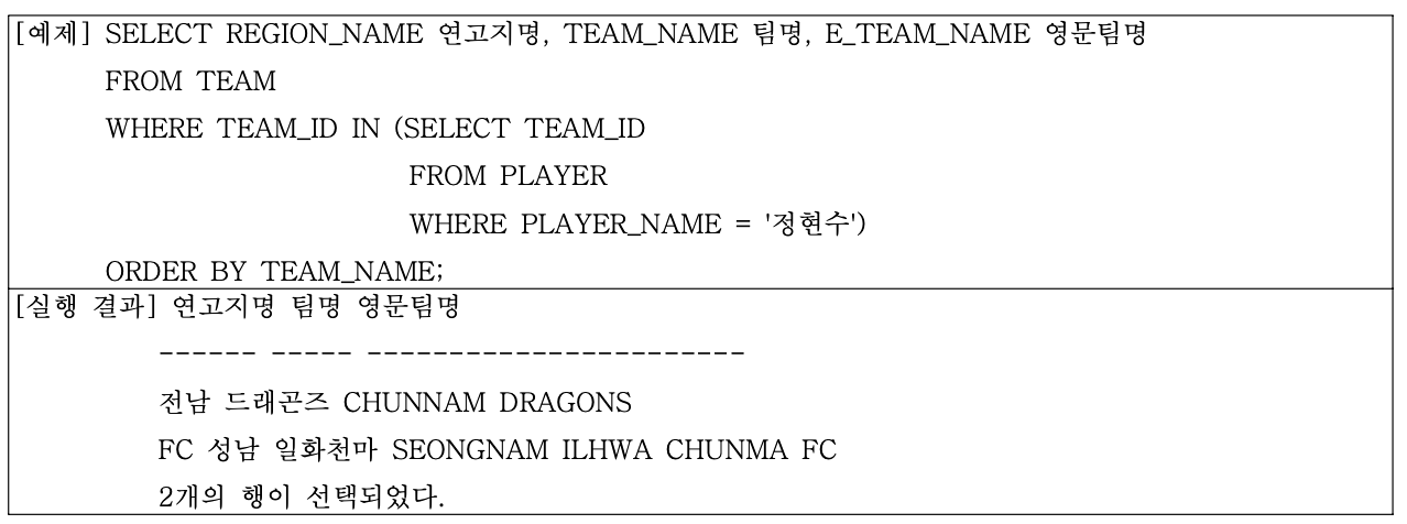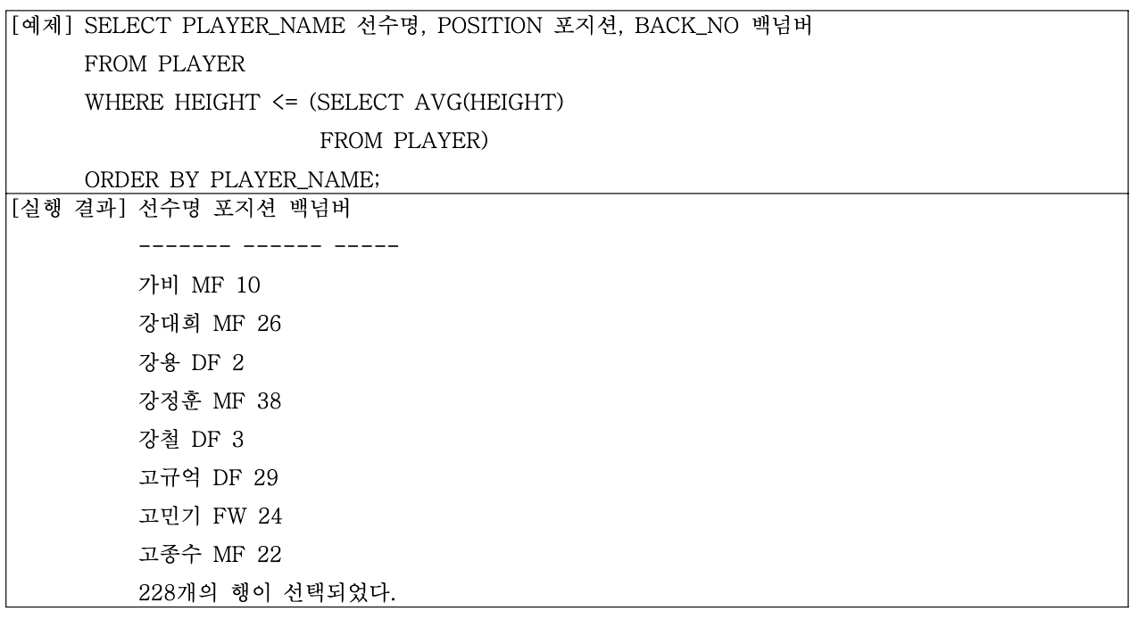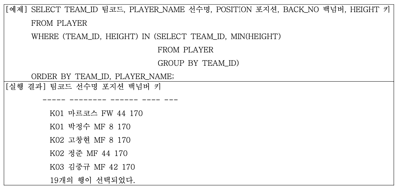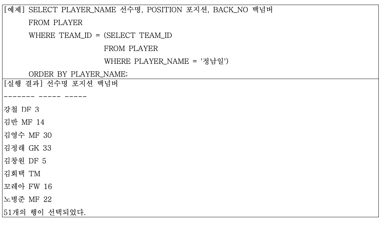 - 서브쿼리에서는 ORDER BY를 사용하지 못한다. ORDER BY절은 SELECT절에서 오직 한 개만 올 수 있기 때문에