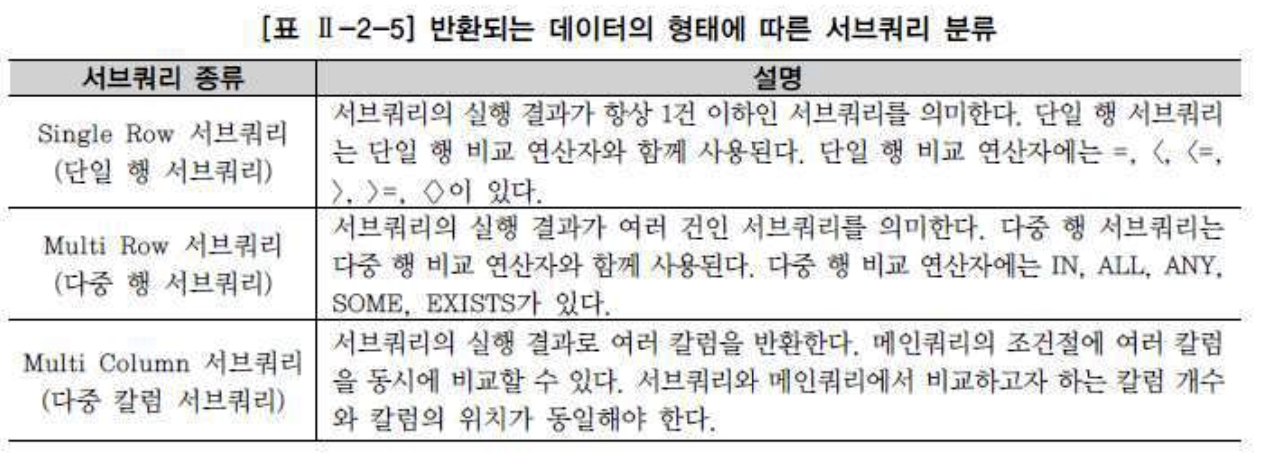 - 서브쿼리는 단일 행(Single Row) 또는 복수 행(Multiple Row) 비교 연산자와 함께 사용 가능하다. 단일 행 비교 연산자는