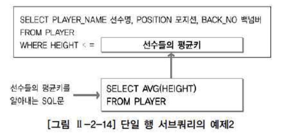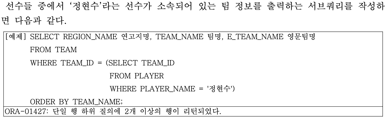 - 서브쿼리가 단일 행 비교 연산자(=, <, <=, >, >=, <>)와 함께 사용할 때는 서브쿼리의 결과 건수가 반드시 1건 이하이어야 한다.