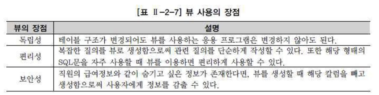 - 테이블은 실제로 데이터를 가지고 있는 반면, 뷰(View)는 실제 데이터를 가지고 있지 않다. 뷰는 단지 뷰 정의(View Definition)만을 가지고 있다. 질의에서 뷰가 사용되면 뷰 정의를 참조해서 DBMS 내부적으로 질의를 재작성(Rewrite)하여 질의를 수행한다.