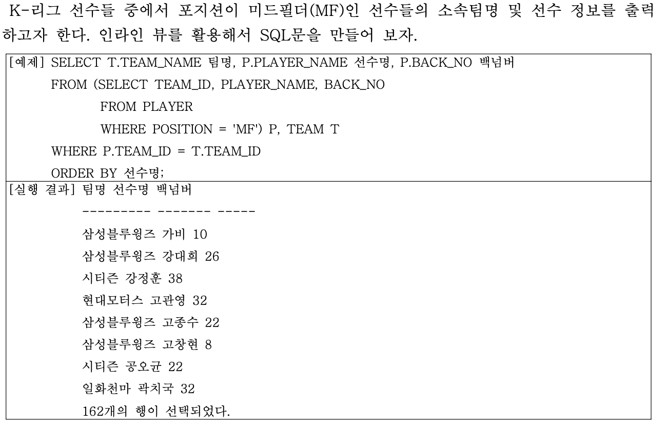 - FROM 절에서 사용되는 서브쿼리를 인라인 뷰(Inline View)라고 한다.