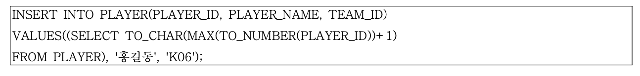 - PLAYER 테이블에 '홍길동'이라는 선수를 삽입하고자 한다. 이때 PLAYER_ID의 값을 현재 사용 중인 PLAYER_ID에 1을 더한 값으로 넣고자 한다.