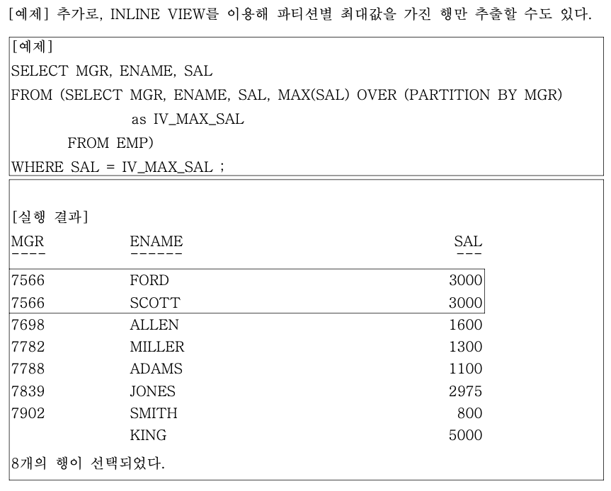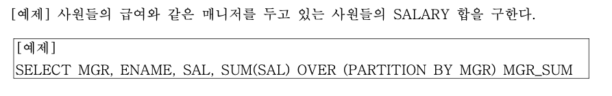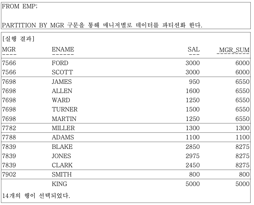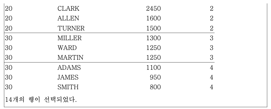 - PARTITION BY 절: 전체 집합을 기준에 의해 소그룹으로 나눌 수 있다.