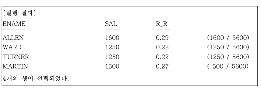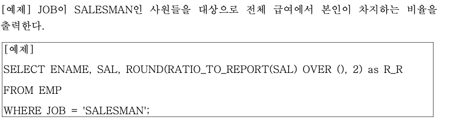 - RATIO_TO_REPORT 함수를 이용해 파티션 내 전체 SUM(칼럼) 값에 대한 행별 칼럼 값의 백분율을 소수점으로 구할 수 있다.