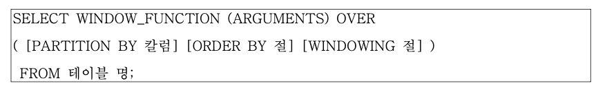 - WINDOW_FUNCTION: 기존에 사용하던 함수도 있고, 새롭게 WINDOW 함수용으로 추가된 함수도 있다.