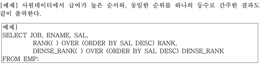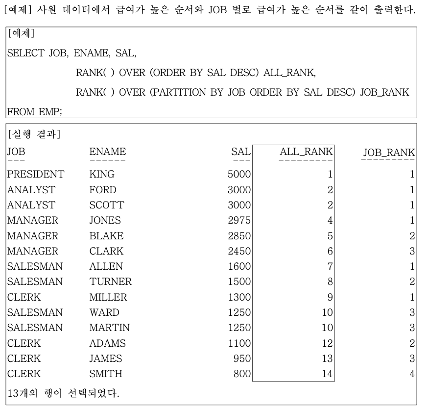 - 특정 범위(PARTITION) 내에서 순위를 구할 수도 있고 전체 데이터에 대한 순위를 구할 수도 있다.