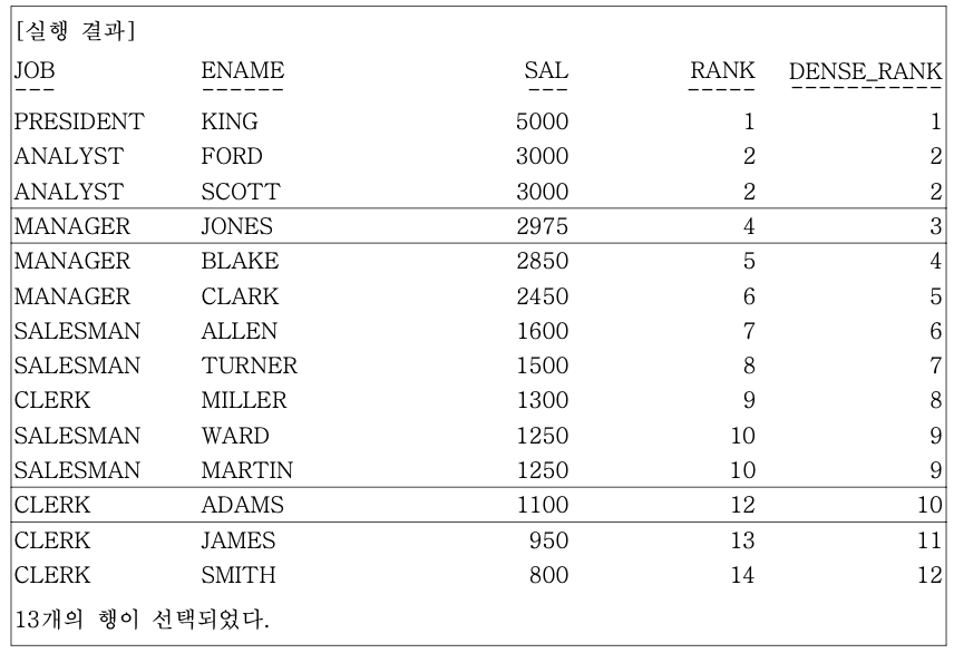 - DENSE_RANK 함수는 RANK 함수와 흡사하나, 동일한 순위를 하나의 건수로 취급하는 것 이 틀린 점이다.