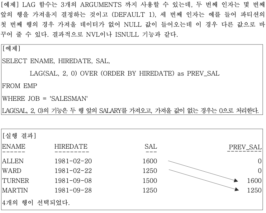 - LAG 함수를 이용해 파티션별 윈도우에서 이전 몇 번째 행의 값을 가져올 수 있다.