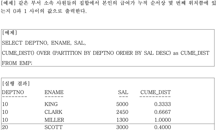 - CUME_DIST 함수를 이용해 파티션별 윈도우의 전체건수에서 현재 행보다 작거나 같은 건 수에 대한 누적백분율을 구한다.