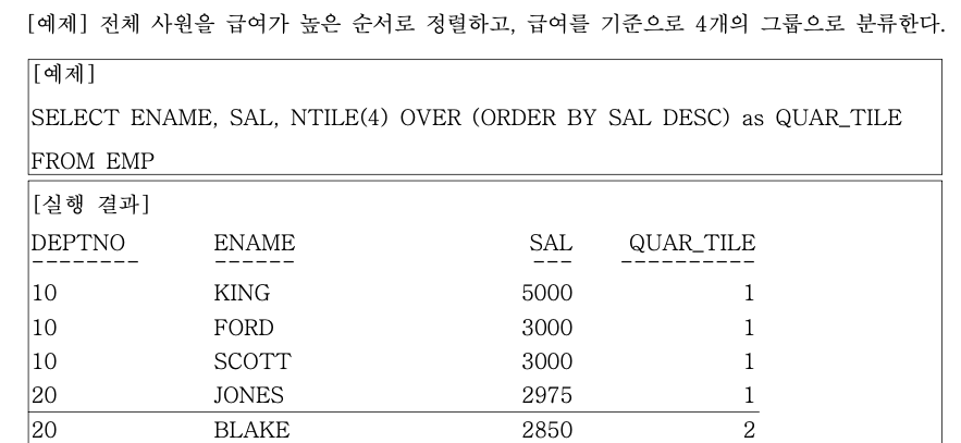 - NTILE 함수를 이용해 파티션별 전체 건수를 ARGUMENT 값으로 N 등분한 결과를 구할 수 있다.