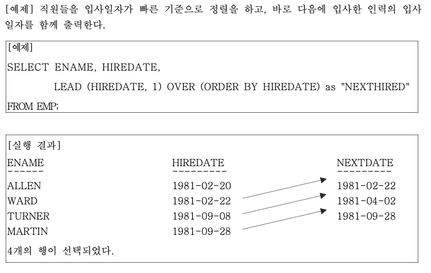 - LEAD 함수를 이용해 파티션별 윈도우에서 이후 몇 번째 행의 값을 가져올 수 있다.