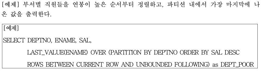 - LAST_VALUE 함수를 이용해 파티션별 윈도우에서 가장 나중에 나온 값을 구한다.