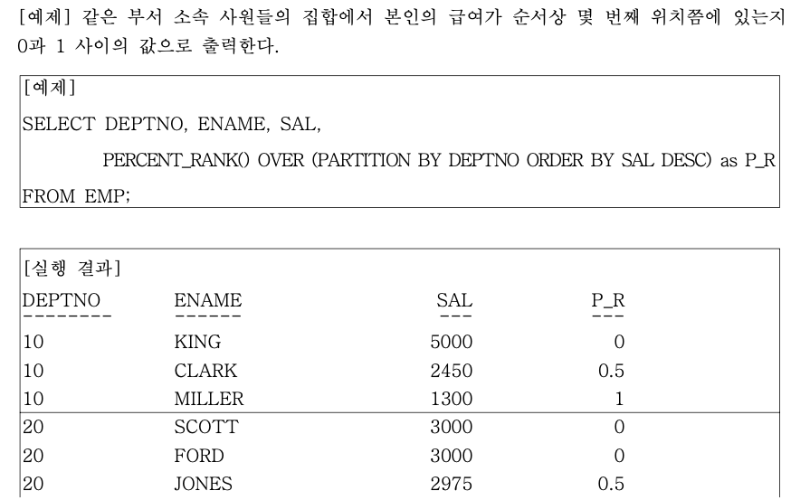 - PERCENT_RANK 함수를 이용해 파티션별 윈도우에서 제일 먼저 나오는 것을 0으로, 제일 늦게 나오는 것을 1로 하여, 값이 아닌 행의 순서별 백분율을 구한다.
