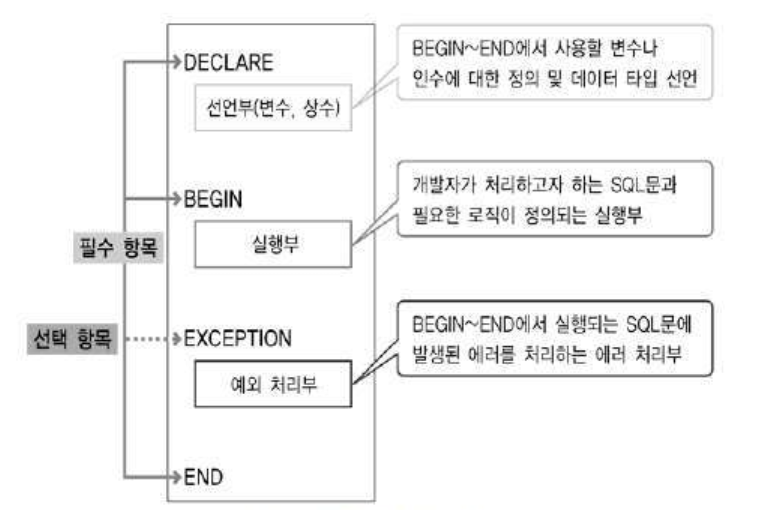 - BEGIN ~ END : 개발자가 처리하고자 하는 SQL문과 여러 가지 비교문, 제어문을 이용하여 필요한 로직을 처리하는 실행부