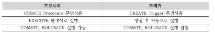 - 프로시저는 BEGIN ~ END 절 내에 COMMIT, ROLLBACK과 같은 트랜잭션 종료 명령어를 사용할 수 있지만, 데이터베이스 트리거는 BEGIN ~ END 절 내에 사용할 수 없다.