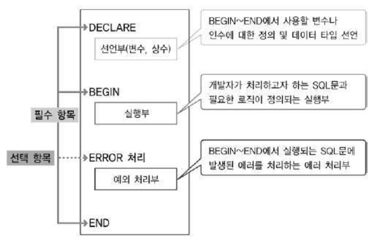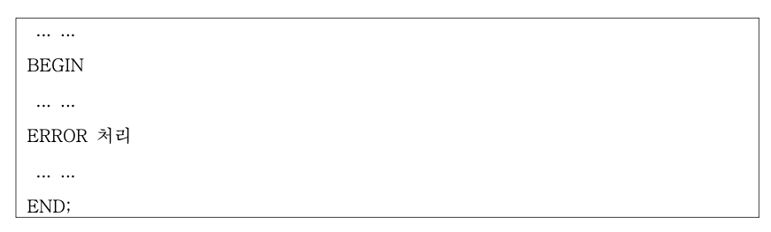 - ERROR 처리 : BEGIN ~ END 절에서 실행되는 SQL문이 실행될 때 에러가 발생하면 에러를 어떻게 처리할지 정의하는 예외 처리부